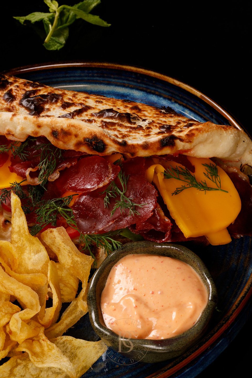 Pastırma, Peynir, Domates, Kornişon Turşu, Domates Sos, Roka, Dereotu ve Cips Patates, Dip Sos…